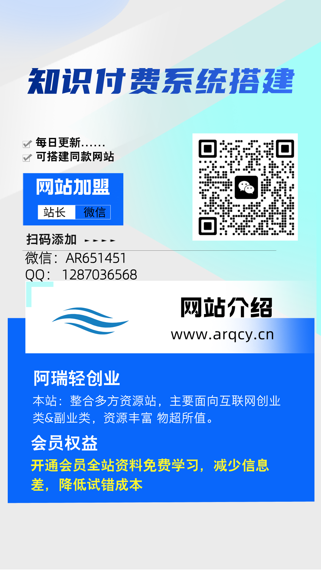 加盟阿瑞网创资源站,加盟搭建同款知识付费资源网站,实现长期稳定被动收入~